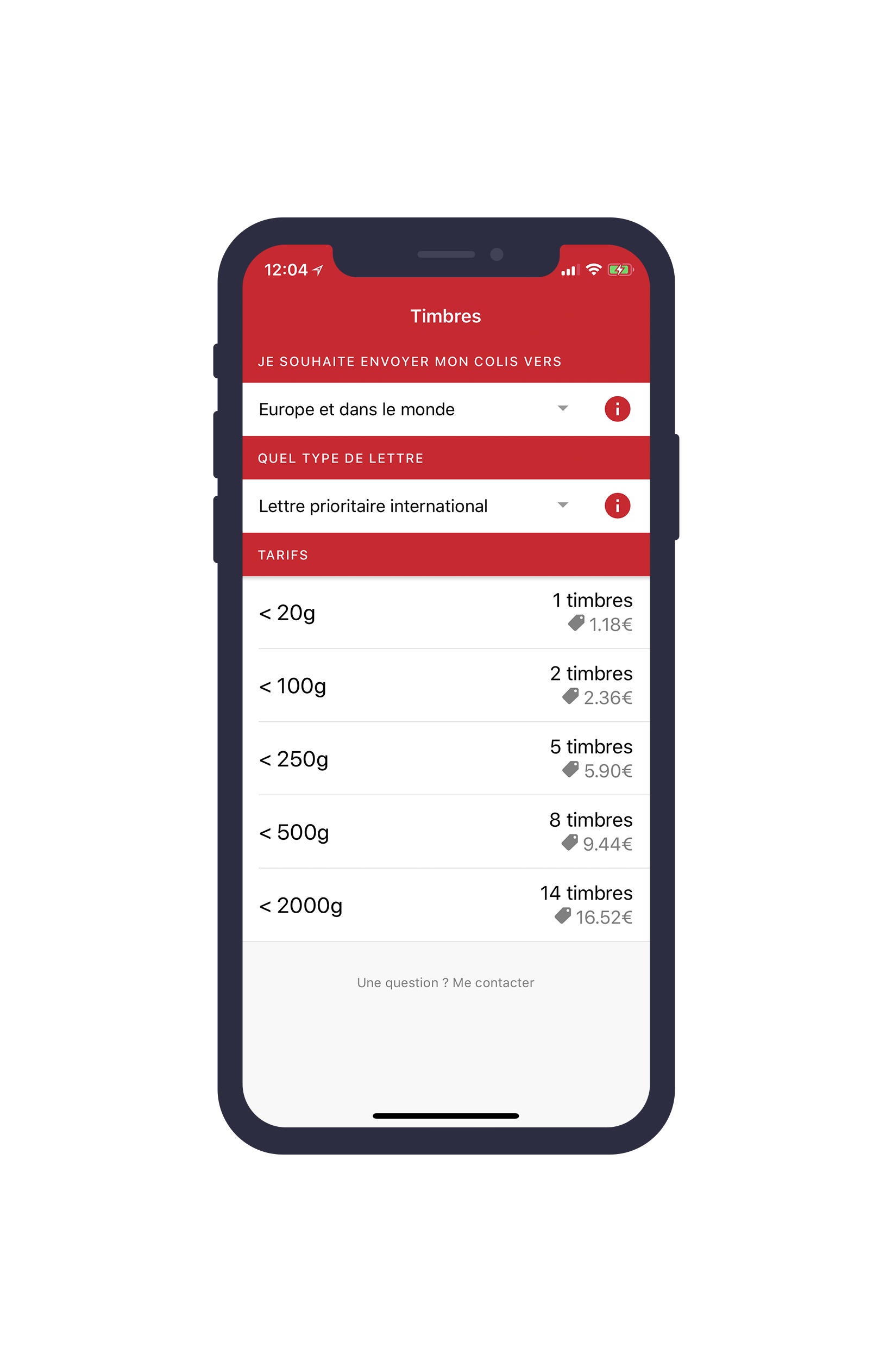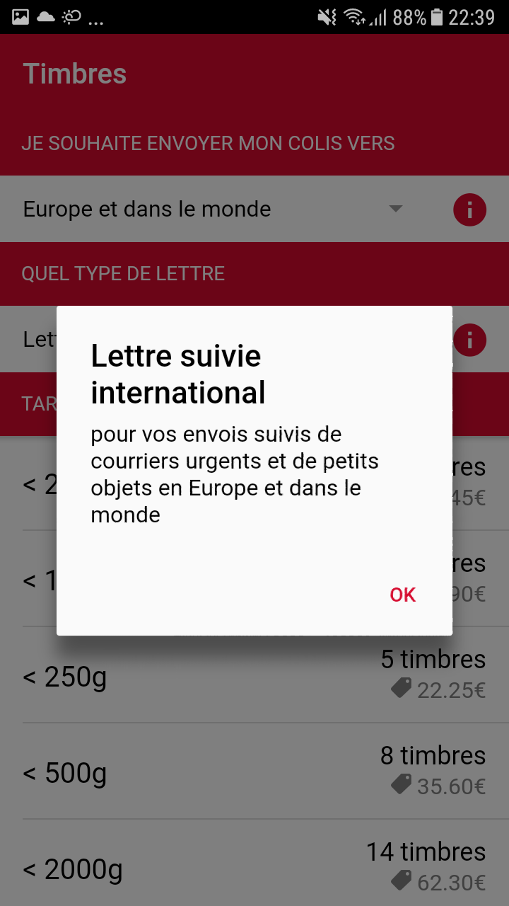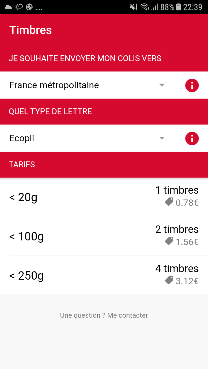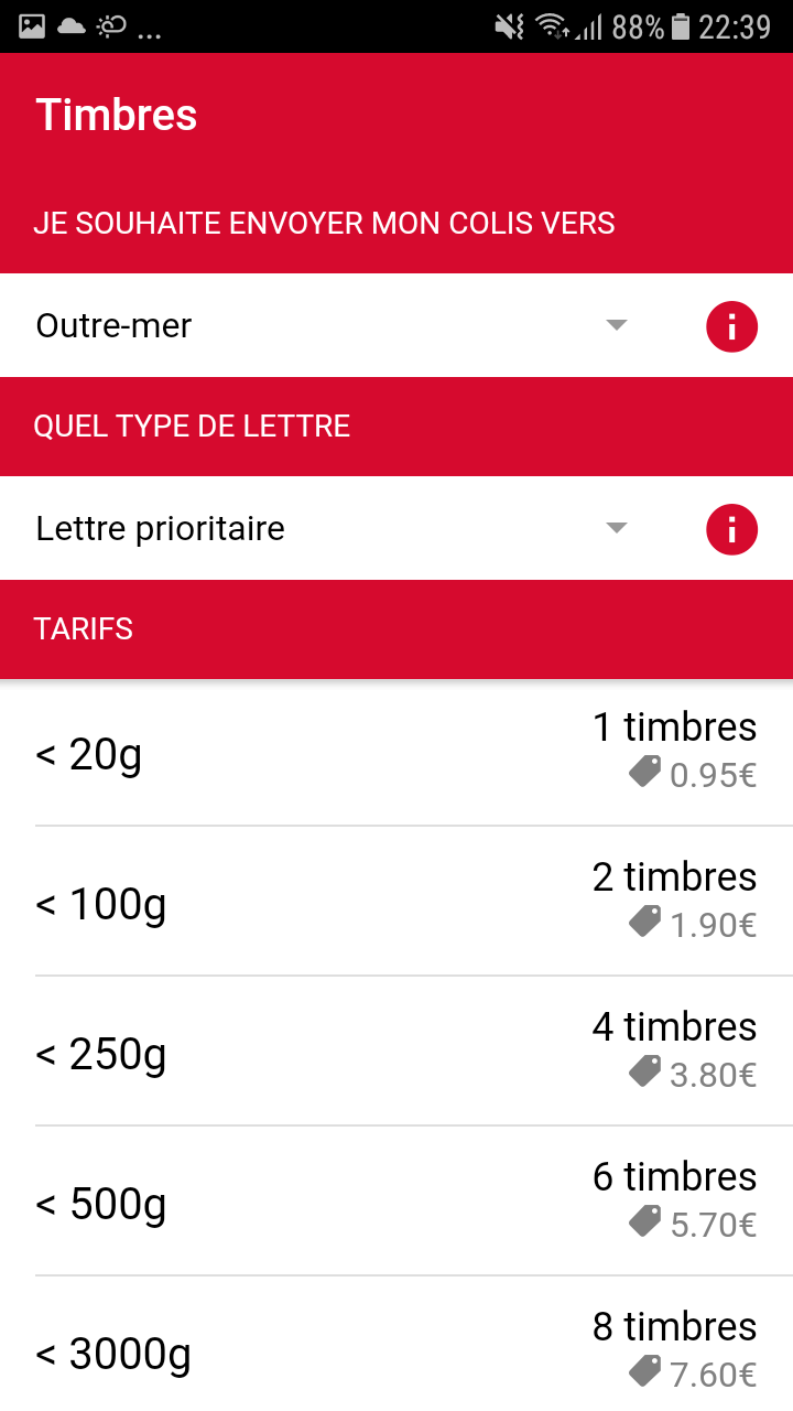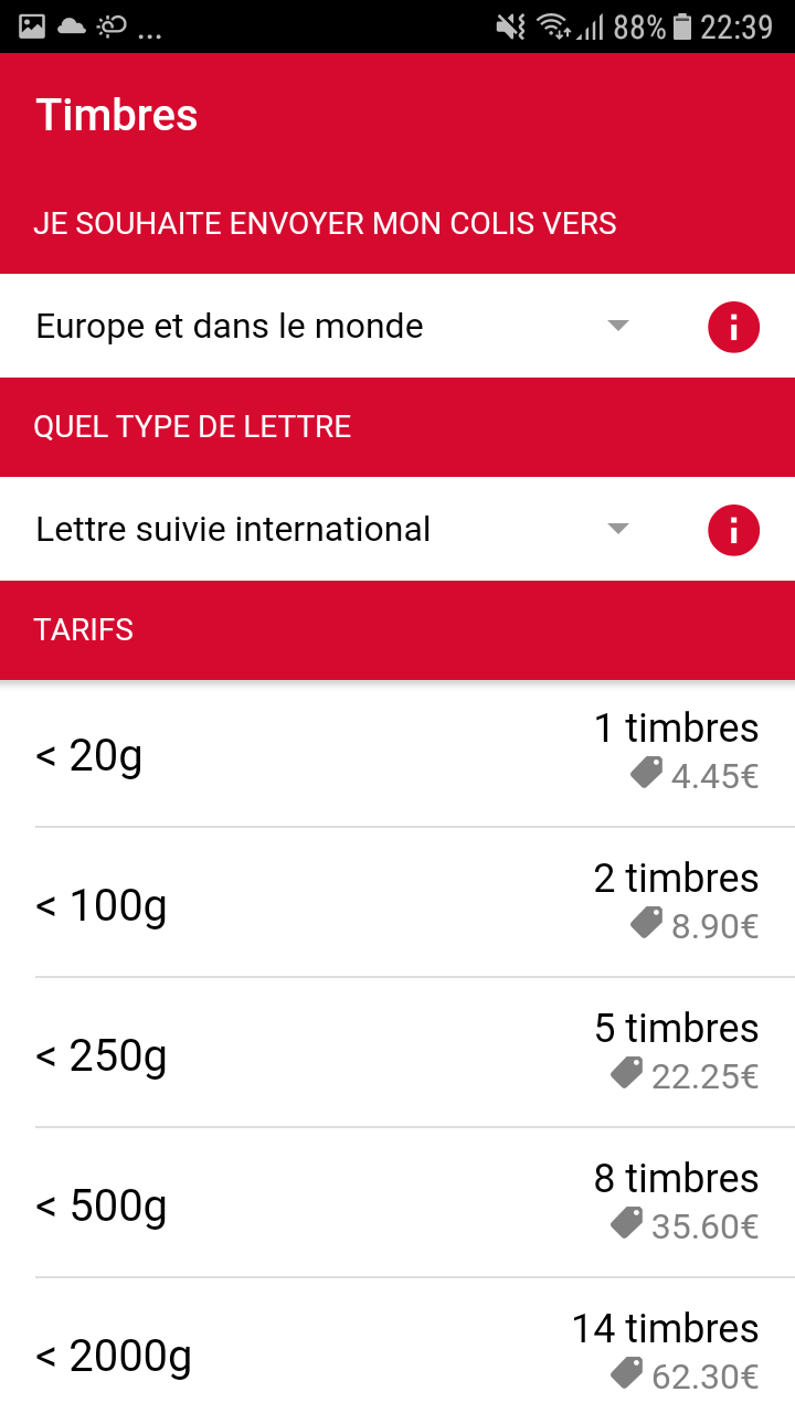 Choisissez une destination, un type de lettre, et l'application vous affiche le nombre de timbre et le prix en fonction du poids de l'enveloppe.